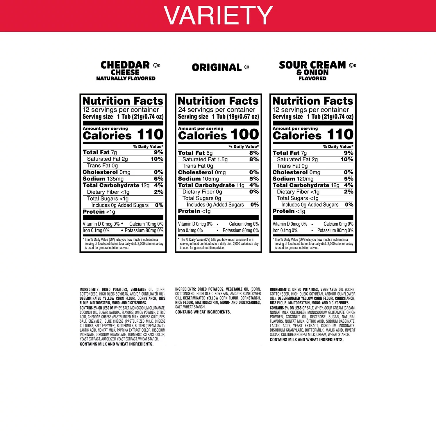 - Pack of 48 Pringles snacks, 12 of each flavor: Original Pringles, Cheddar Cheese Flavored Pringles, and Sour Cream & Onion Flavored Pringles