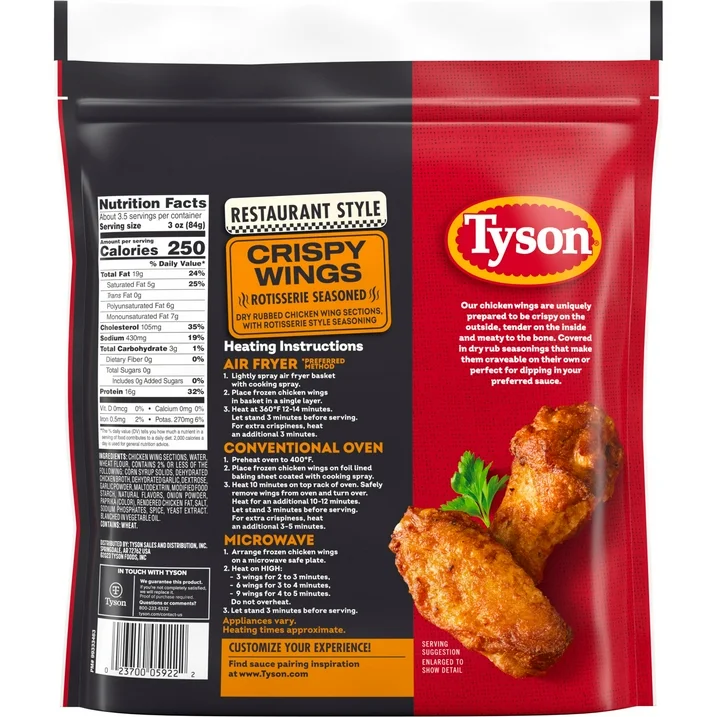 Elevate any meal with Tyson Restaurant Style Rotisserie Seasoned Crispy Wings! Experience the irresistible crunch and juicy flavor you crave, right from the comfort of your home. Our fully cooked, dry rubbed wings are infused with savory rotisserie seasoning that’s sure to please everyone. Perfect for dipping, sharing or savoring solo, our wings are the ultimate crowd-pleaser for any occasion. Simply prepare our wings in the air fryer, oven or microwave for a quick and delicious snack, appetizer or part of a meal. Our chicken is raised with no added hormones or steroids, and each serving boasts 16 grams of protein and only 3 net carbs. One 16-ounce bag contains about 3.5 servings, making it the perfect choice for your next gathering. Indulge in big wing flavor with Tyson Restaurant Style Rotisserie Seasoned Crispy Wings!